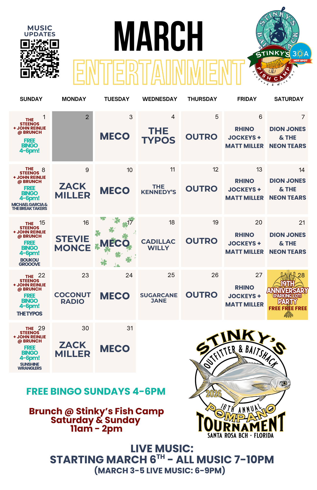 Sunday Brunch at Stinky’s Fish Camp is not to be missed! Brunch is served 10AM - 3:00PM with live music in the house from 11AM till 2PM. Favorites include their Crawfish Pie, Oyster Log, and Stinky's Stew - featuring shrimp, mussels, fish, oysters, snow crab legs, roast corn, potatoes, basil butter broth, & toasted garlic bread. Wash it all down with a house made bloody mary or a frozen Stink Juice.